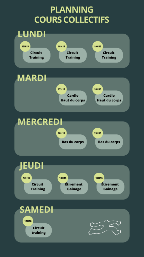 Un bilan personnalisé sera réalisé afin de définir précisèment votre objectif et votre programme à venir. Cette formule vous donne accès à un accompagnement régulier et modulable selon votre quotidien.TARIFS COURS COLLECTIFS